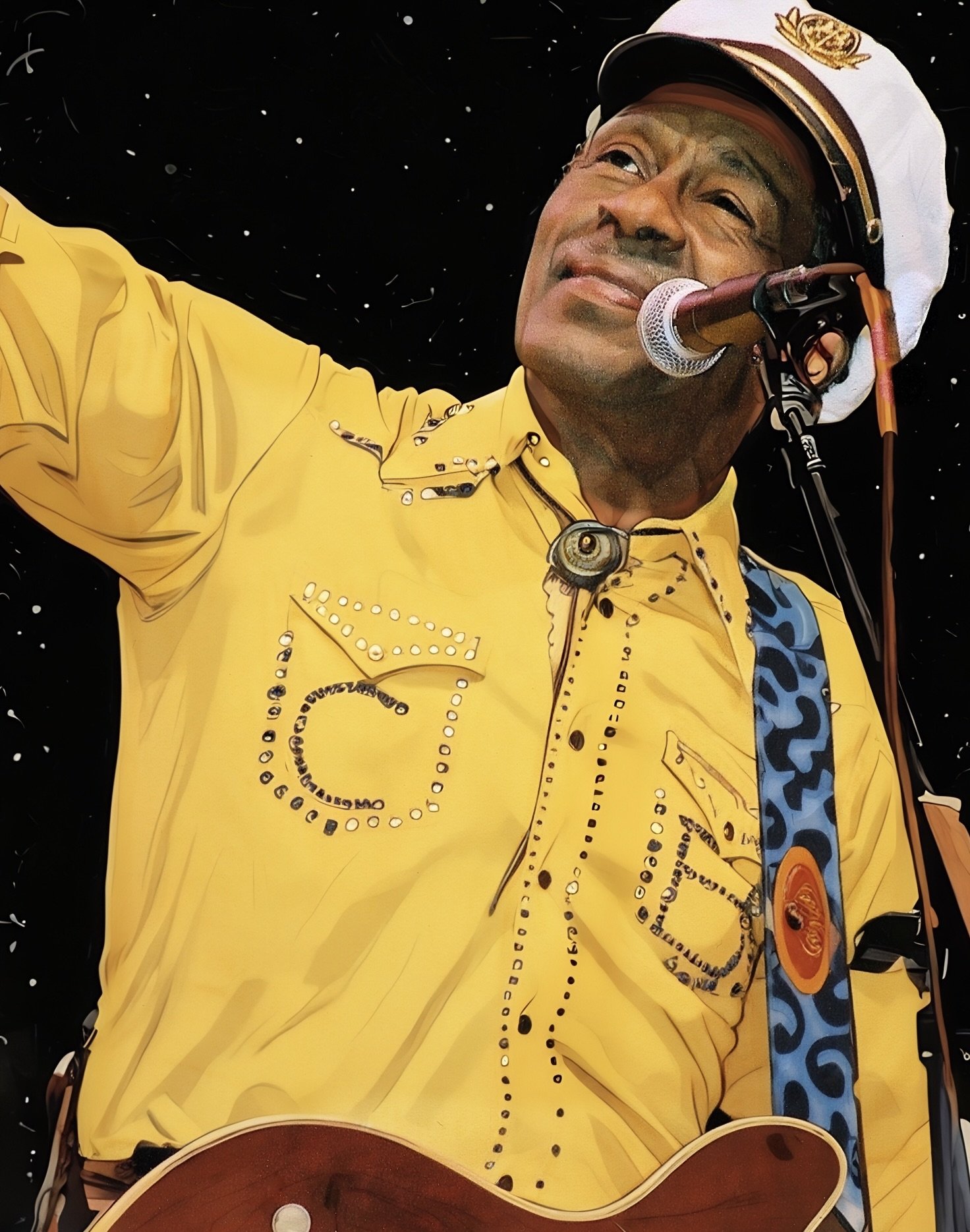 Emerging from St. Louis’s vibrant Black club scene, Chuck Berry (1926 – 2017) blended blues, R&B, and country influences to help define the sound and storytelling style of early rock and roll. His music built directly on the structures of electric blues, translating its guitar riffs, shuffle rhythms, and lyrical themes into songs that reached national and international youth audiences.